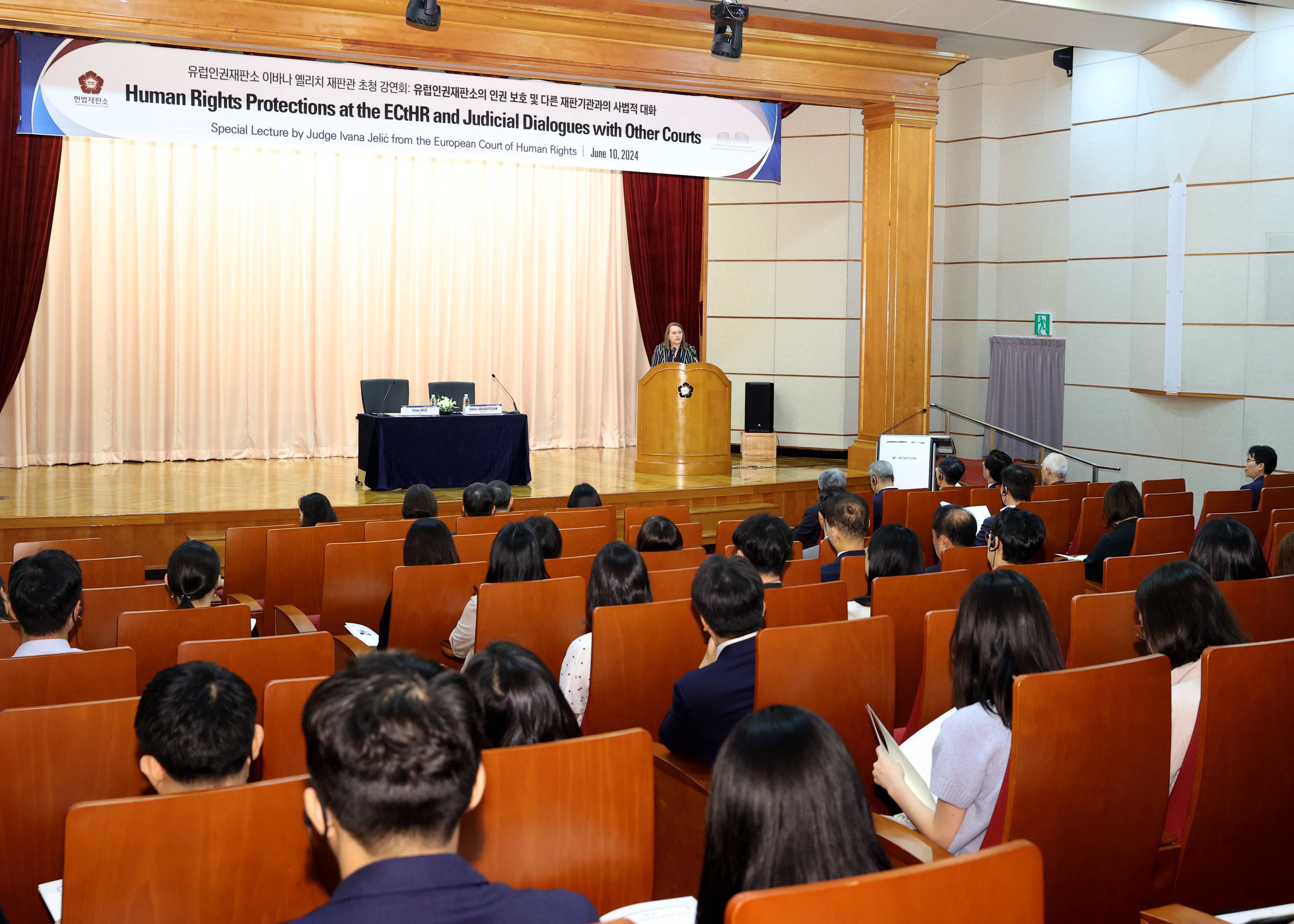 옐리치 재판관은 10일 헌법재판소 대강당에서 재판관과 연구관, 사무처 직원은 물론 한국헌법학회와 한국공법학회, 인권법학회 등의 회원으로 있는 교수와 변호사 등이 참석한 가운데 특별강연회를 열었으며, 11일에는 이종석 헌법재판소장을 비롯한 헌법재판소 재판관들과 간담회도 가졌습니다.
