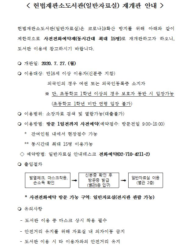 안내 헌법재판소도서관(일반자료실) 재개관 안내 도서정보과 / 2020. 7. 24. / 1591