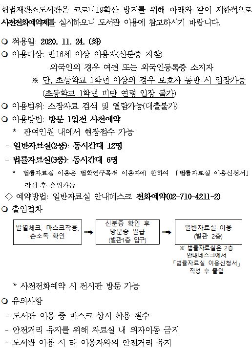 안내 코로나19 사회적거리 2단계 격상에 따른 헌법재판소도서관 이용 안내 도서정보과 / 2020. 11. 24. / 529