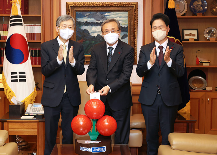 이날 사랑의 열매 전달식을 위해 유남석 재판소장을 예방한 조흥식 회장과 김상균 사무총장은 이웃사랑 성금을 비롯한 헌법재판소의 나눔 실천에 감사를 표했습니다.